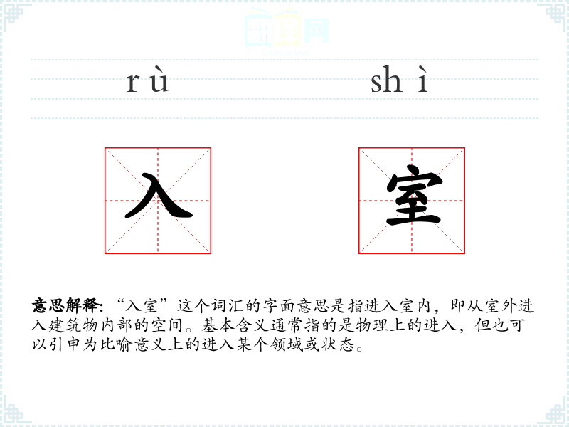 “入室”一词源于古代汉语,字面上的“入”表示进入,“室”表示房间或内部空间。随着语言的发展,这个词的用法逐渐扩展,包括了比喻和专业领域的特定含义。