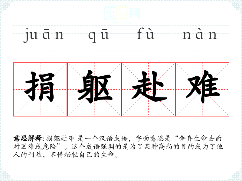捐躯赴难 是一个汉语成语,字面意思是“舍弃生命去面对困难或危险”。这个成语强调的是为了某种高尚的目的或为了他人的利益,不惜牺牲自己的生命。