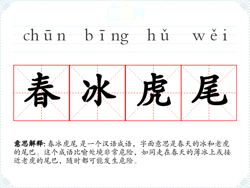 春冰虎尾 是一个汉语成语,字面意思是春天的冰和*的尾巴。这个成语比喻处境非常危险,如同走在春天的冰上或接近**的尾巴,随时都可能发生危险。
