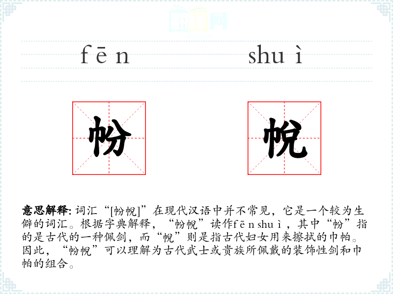 词汇“[帉帨]”在现代汉语中并不常见,它是一个较为生僻的词汇。根据字典解释,“帉帨”读作fēn shuì,其中“帉”指的是古代的一种佩剑,而“帨”则是指古代妇女用来擦拭的巾帕。因此,“帉帨”可以理解为古代武士或贵族所佩戴的装饰性剑和巾帕的组合。