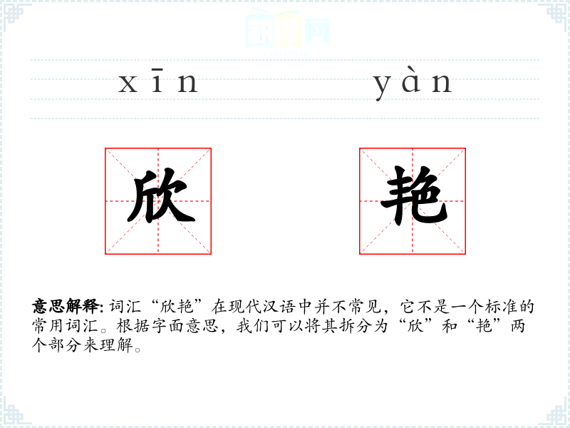 词汇“欣艳”在现代汉语中并不常见,它不是一个标准的常用词汇。根据字面意思,我们可以将其拆分为“欣”和“艳”两个部分来理解。