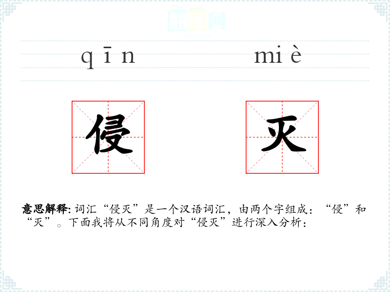 “侵”字最早见于《说文解字》,意为侵犯;“灭”字同样古老,意为消灭。两个字组合在一起,形成了“侵灭”这个词汇,用来描述通过侵略手段达到消灭目的的行为。