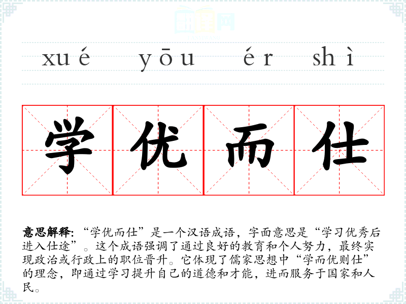 “学优而仕”是一个汉语成语,字面意思是“学优秀后进入仕途”。这个成语强调了通过良好的教育和个人努力,最终实现政治或行政上的职位晋升。它体现了儒家思想中“学而优则仕”的理念,即通过学提升自己的道德和才能,进而服务于国家和人民。