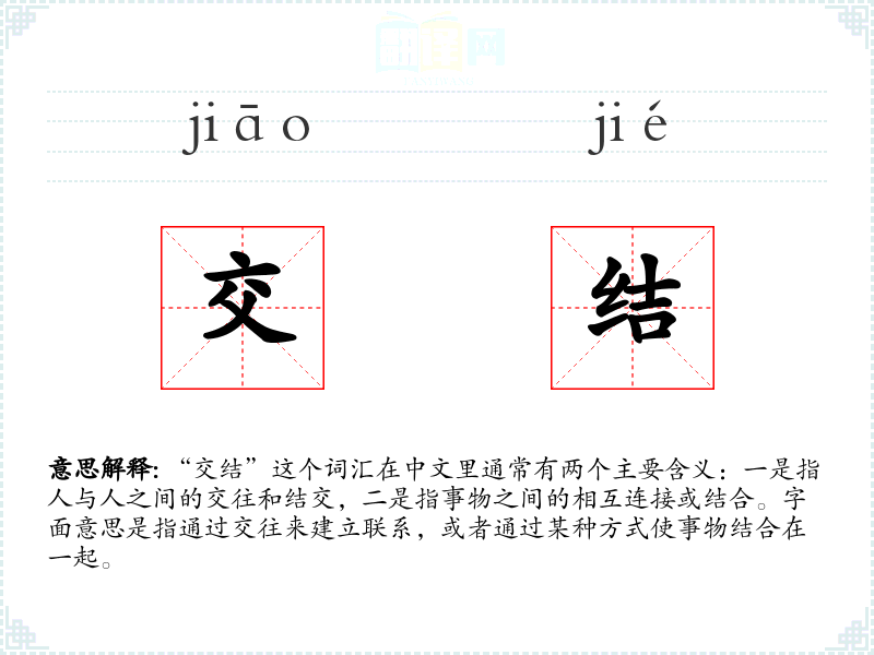 “交结”这个词汇在中文里通常有两个主要含义:一是指人与人之间的交往和结交,二是指事物之间的相互连接或结合。字面意思是指通过交往来建立联系,或者通过某种方式使事物结合在一起。