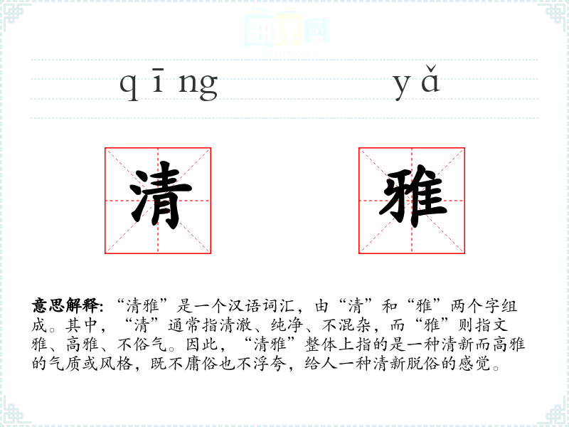 在英语中,“清雅”可以对应为“elegant and refined”或“graceful and tasteful”。这些词汇在表达上与“清雅”相似,都强调了一种高雅而不失清新的气质。