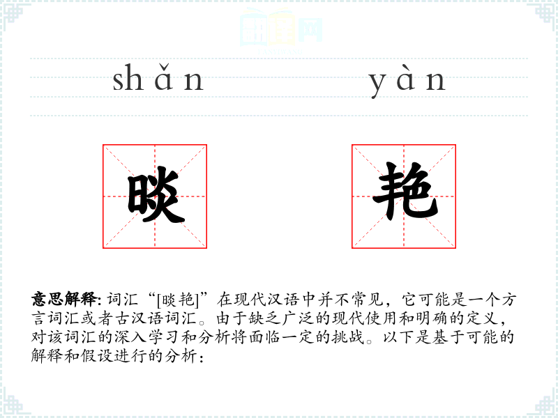词汇“[晱艳]”在现代汉语中并不常见,它可能是一个方言词汇或者古汉语词汇。由于缺乏广泛的现代使用和明确的定义,对该词汇的深入学习和分析将面临一定的挑战。以下是基于可能的解释和假设进行的分析:
