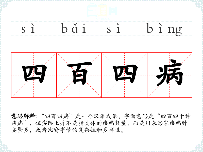 “四百四病”是一个汉语成语,字面意思是“四百四十种疾病”,但实际上并不是指具体的疾病数量,而是用来形容疾病种类繁多,或者比喻事情的复杂性和多样性。