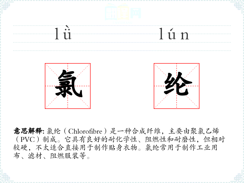 在不同语言中,氯纶的对应词汇可能会有所不同,但其基本含义和应用领域是相似的。例如,在英语中,氯纶可以被称为“Chlorofibre”或“PVC fibre”。