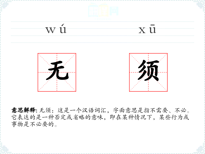无须:这是一个汉语词汇,字面意思是指不需要、不必。它表达的是一种否定或省略的意味,即在某种情况下,某些行为或事物是不必要的。