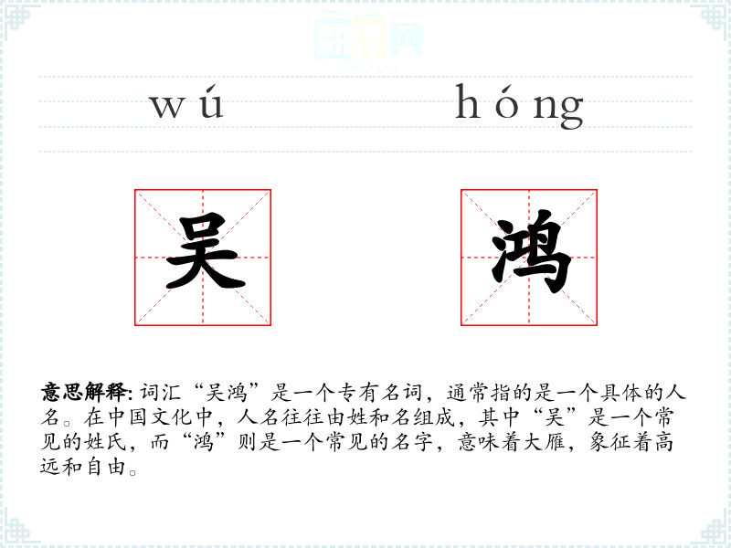 - 词源:“吴”姓源于古代吴国,“鸿”字源于古代对大雁的称呼。