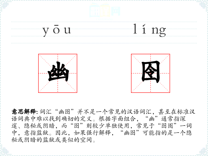 由于“幽囹”不是一个标准词汇,其字面意思和基本含义难以确定。如果从字面组合来看,可以理解为一个隐秘或阴暗的监狱或类似的空间。