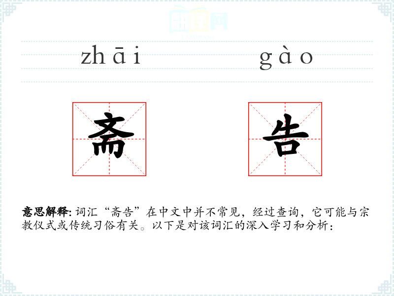 词汇“斋告”在中文中并不常见,经过查询,它可能与*仪式或传统俗有关。以下是对该词汇的深入学*和分析: