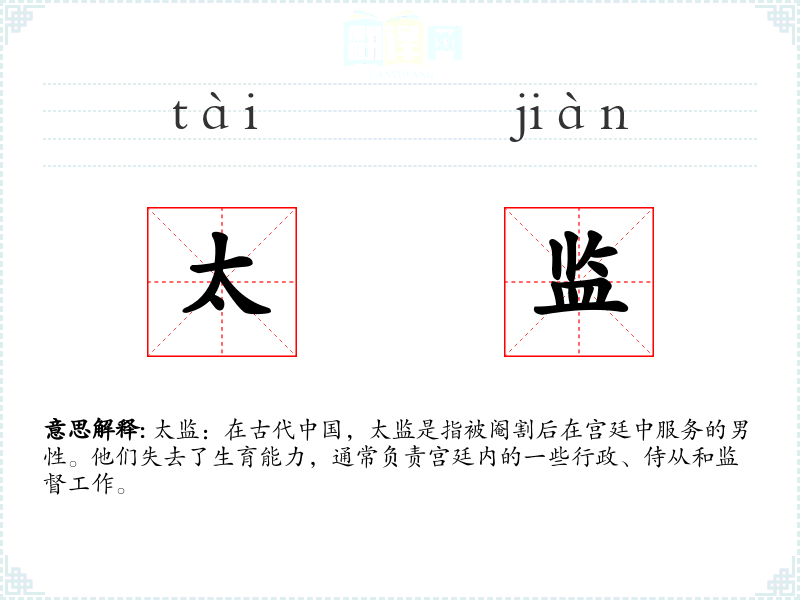 "太监"的意思解释、太监是什么意思由翻译网汉语词典查词提供。
