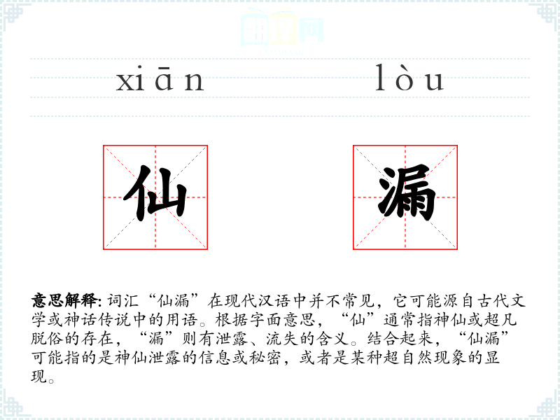 词汇“仙漏”在现代汉语中并不常见,它可能源自古代文学或神话传说中的用语。根据字面意思,“仙”通常指神仙或超凡脱俗的存在,“漏”则有泄露、流失的含义。结合起来,“仙漏”可能指的是神仙泄露的信息或秘密,或者是某种超自然现象的显现。