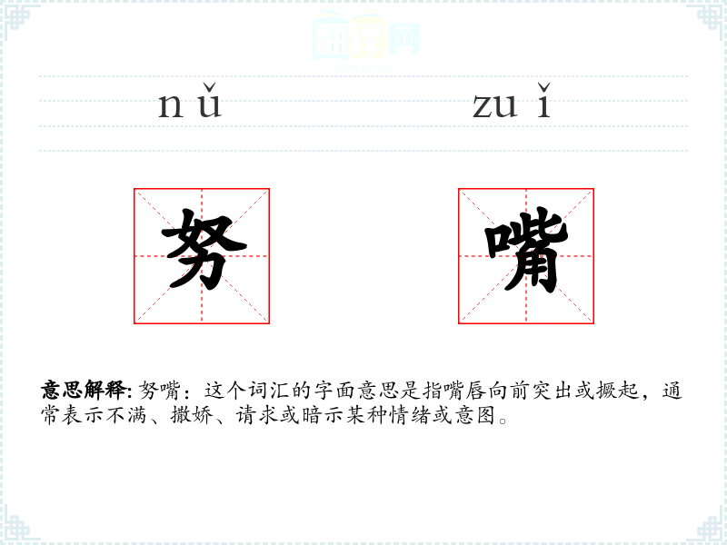 - 反义词:微笑、咧嘴(这些词表示的情绪与“努嘴”相反)
