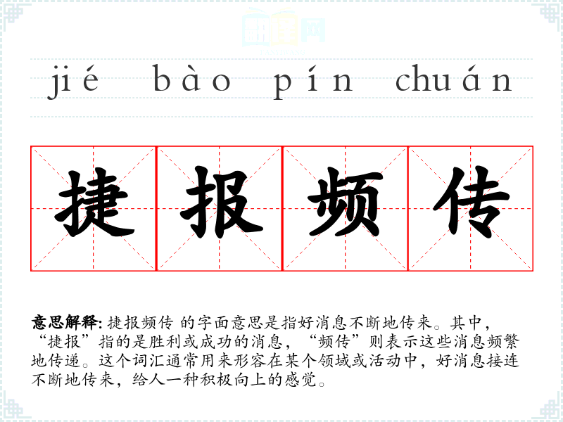 - 喜讯连连:表示好消息一个接一个地传来,与“捷报频传”意思相近,但更侧重于喜悦的情感。