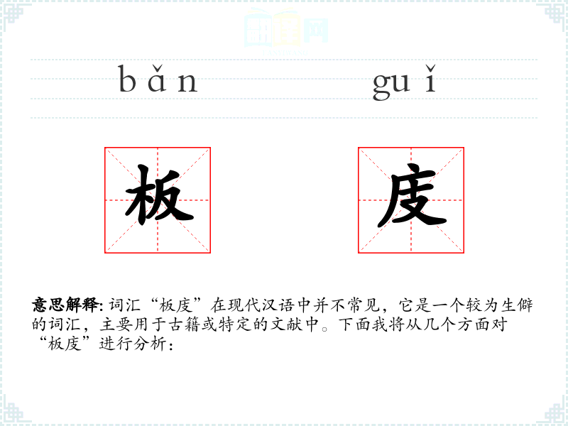 词汇“板庋”在现代汉语中并不常见,它是一个较为生僻的词汇,主要用于古籍或特定的文献中。下面我将从几个方面对“板庋”进行分析:
