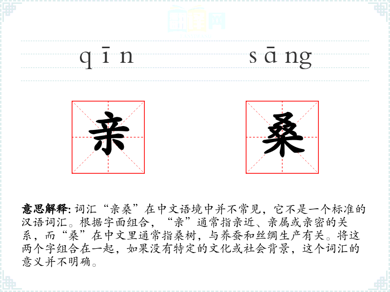 词汇“亲桑”在中文语境中并不常见,它不是一个标准的汉语词汇。根据字面组合,“亲”通常指亲近、亲属或亲密的关系,而“桑”在中文里通常指桑树,与养蚕和丝绸生产有关。将这两个字组合在一起,如果没有特定的文化或社会背景,这个词汇的意义并不明确。