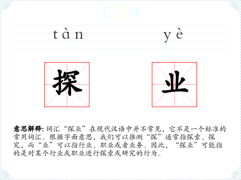 词汇“探业”在现代汉语中并不常见,它不是一个标准的常用词汇。根据字面意思,我们可以推测“探”通常指探索、探究,而“业”可以指行业、职业或者业务。因此,“探业”可能指的是对某个行业或职业进行探索或研究的行为。