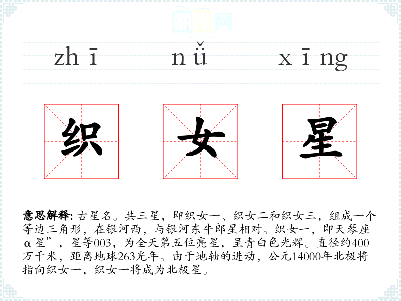 1.古星名。共三星,即织女一、织女二和织女三,组成一个等边三角形,在银河西,与银河东牛郎星相对。织女一,即天琴座α星”,星等003,为全天第五位亮星,呈青白色光辉。直径约400万千米,距离地球263光年。由于地轴的进动,公元14000年北极将指向织女一,织女一将成为北极星。