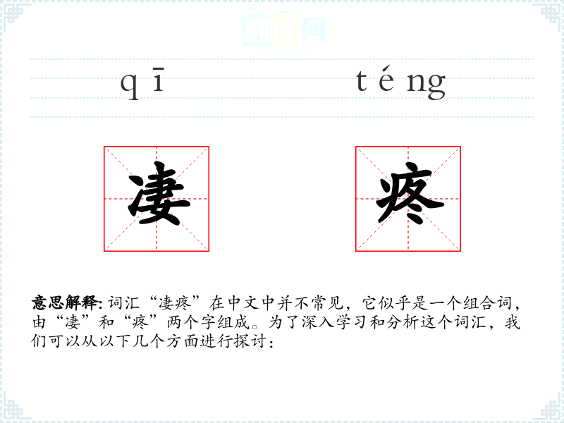 词汇“凄疼”在中文中并不常见,它似乎是一个组合词,由“凄”和“疼”两个字组成。为了深入学习和分析这个词汇,我们可以从以下几个方面进行探讨: