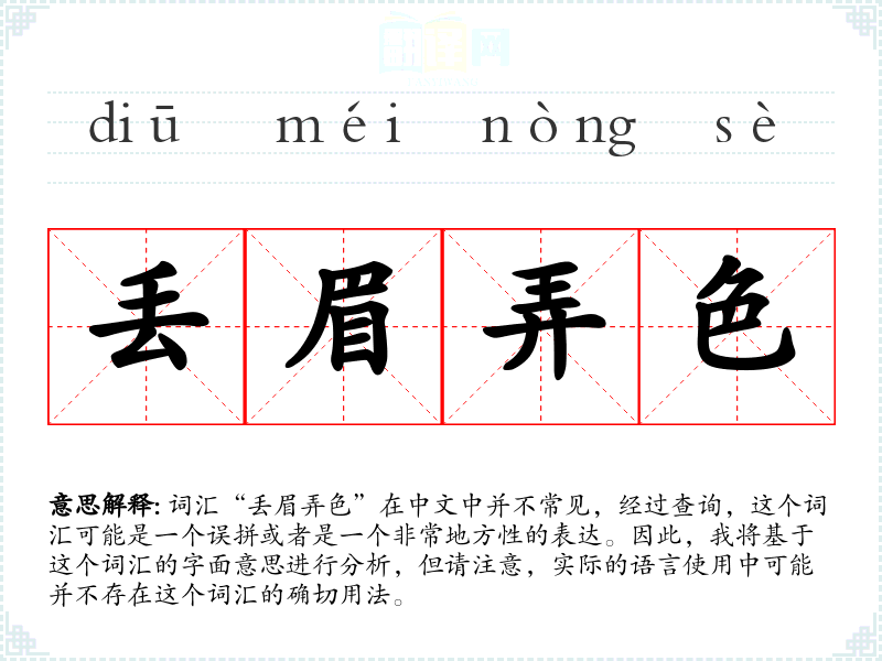 词汇“丢眉弄色”在中文中并不常见,经过查询,这个词汇可能是一个误拼或者是一个非常地方性的表达。因此,我将基于这个词汇的字面意思进行分析,但请注意,实际的语言使用中可能并不存在这个词汇的确切用法。