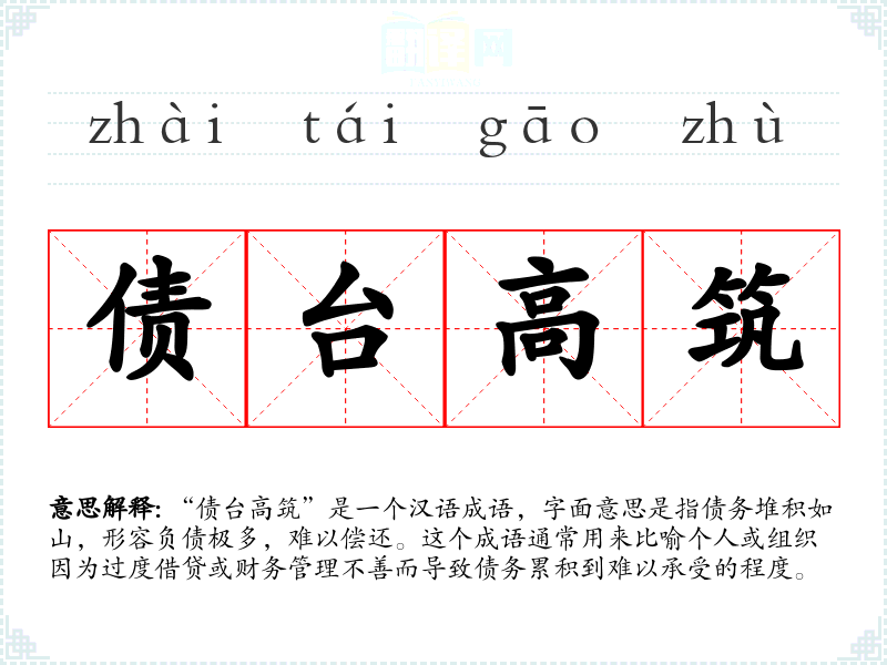 “债台高筑”是一个汉语成语,字面意思是指债务堆积如山,形容负债极多,难以偿还。这个成语通常用来比喻个人或组织因为过度借贷或财务管理不善而导致债务累积到难以承受的程度。