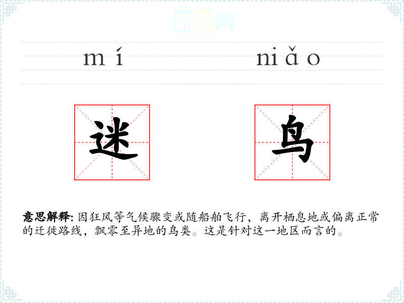 因狂风等气候骤变或随船舶飞行,离开栖息地或偏离正常的迁徙路线,飘零至异地的鸟类。这是针对这一地区而言的。