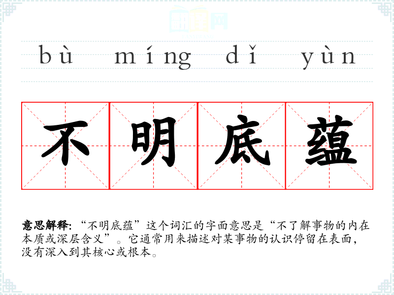 “不明底蕴”这个词汇的字面意思是“不了解事物的内在本质或深层含义”。它通常用来描述对某事物的认识停留在表面,没有深入到其核心或根本。