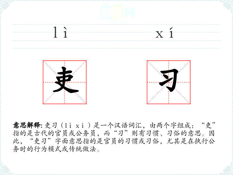“吏”字在古代汉语中指的是低级官员,而“”字源自“学”或“惯”。随着时间的推移,“吏”这个词汇逐渐固定下来,用来描述官员的行为*惯或行政传统。