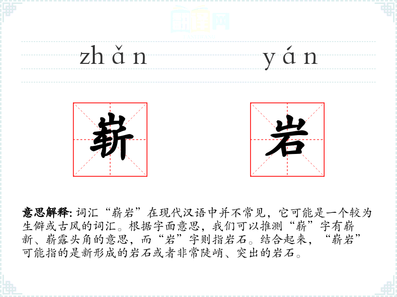 词汇“崭岩”在现代汉语中并不常见,它可能是一个较为生僻或古风的词汇。根据字面意思,我们可以推测“崭”字有崭新、崭露头角的意思,而“岩”字则指岩石。结合起来,“崭岩”可能指的是新形成的岩石或者非常陡峭、突出的岩石。