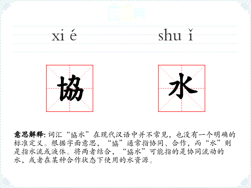 词汇“協水”在现代汉语中并不常见,也没有一个明确的标准定义。根据字面意思,“協”通常指协同、合作,而“水”则是指水流或液体。将两者结合,“協水”可能指的是协同流动的水,或者在某种合作状态下使用的水资源。