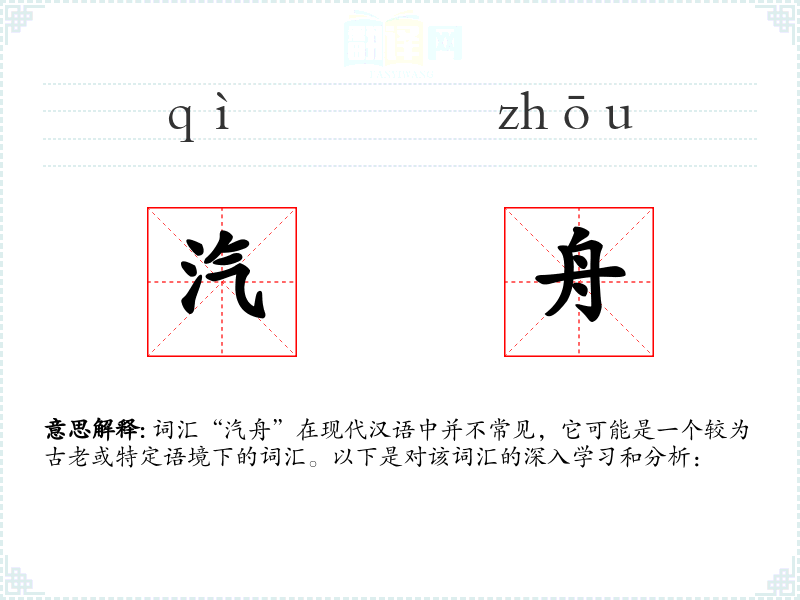 词汇“汽舟”在现代汉语中并不常见,它可能是一个较为古老或特定语境下的词汇。以下是对该词汇的深入学习和分析: