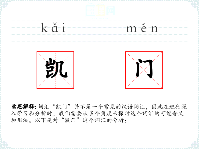 由于“凯门”不是一个标准的汉语词汇,我们无法给出一个确切的基本定义。它可能是某个特定领域或方言中的词汇,或者是某个特定文化或社群中的术语。