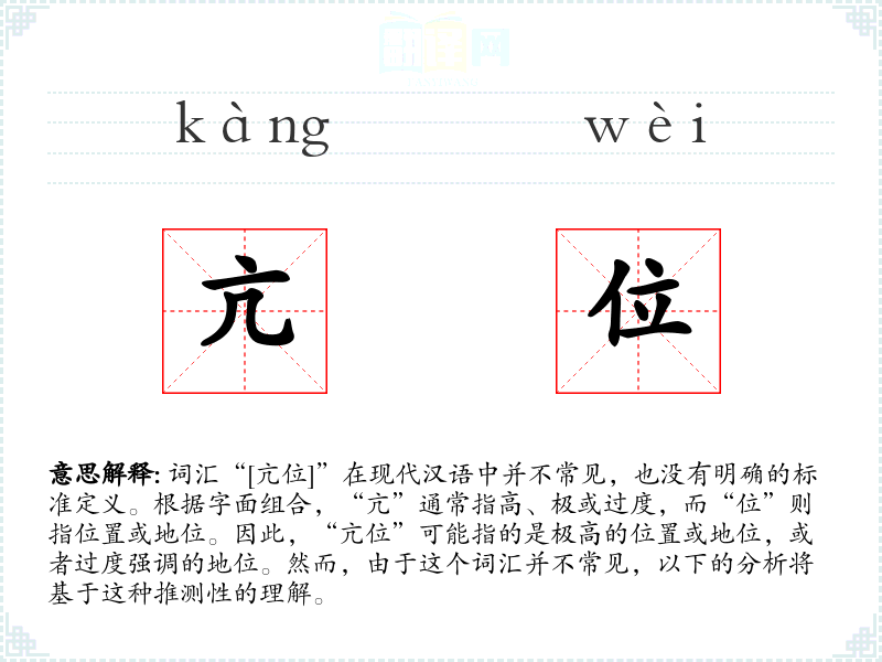 词汇“[亢位]”在现代汉语中并不常见,也没有明确的标准定义。根据字面组合,“亢”通常指高、极或过度,而“位”则指位置或地位。因此,“亢位”可能指的是极高的位置或地位,或者过度强调的地位。然而,由于这个词汇并不常见,以下的分析将基于这种推测性的理解。