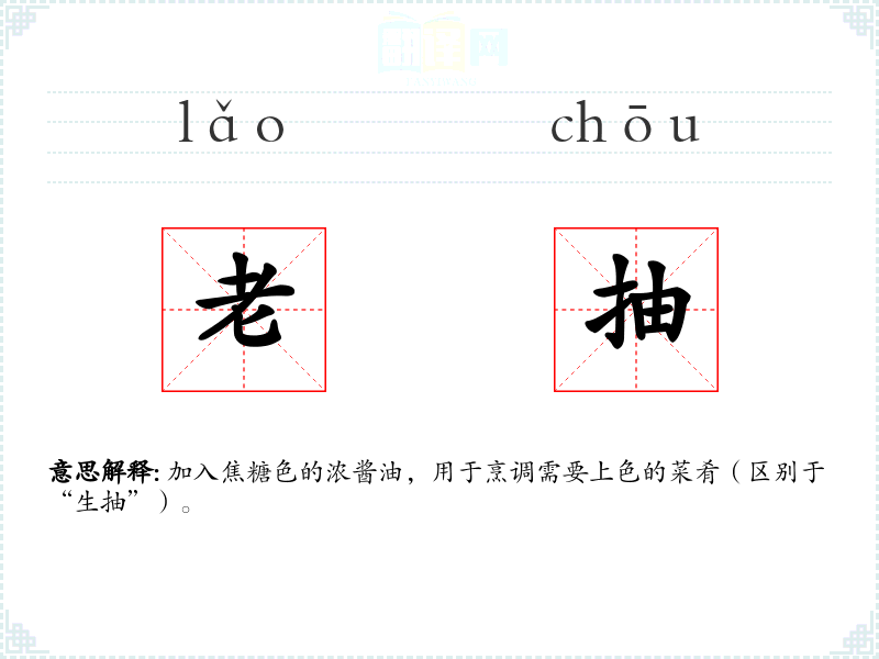 加入焦糖色的浓酱油,用于烹调需要上色的菜肴(区别于“生抽”)。