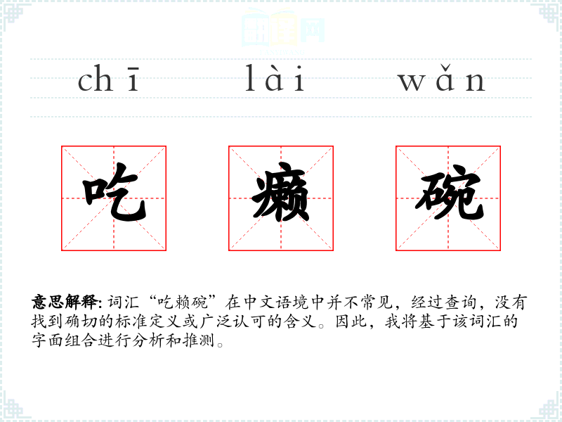 词汇“吃赖碗”在中文语境中并不常见,经过查询,没有找到确切的标准定义或广泛认可的含义。因此,我将基于该词汇的字面组合进行分析和推测。
