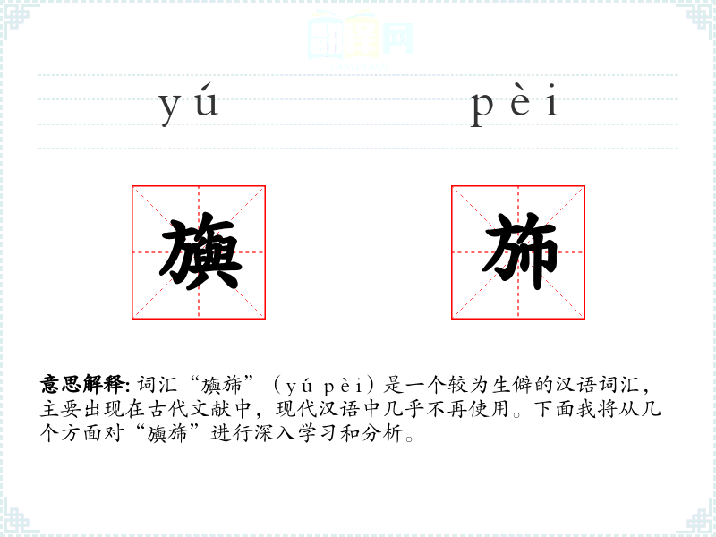 词汇“旟旆”(yú pèi)是一个较为生僻的汉语词汇,主要出现在古代文献中,现代汉语中几乎不再使用。下面我将从几个方面对“旟旆”进行深入学*和分析。