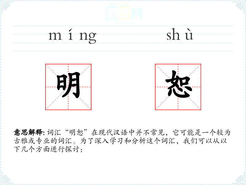词汇“明恕”在现代汉语中并不常见,它可能是一个较为古雅或专业的词汇。为了深入学*和分析这个词汇,我们可以从以下几个方面进行探讨: