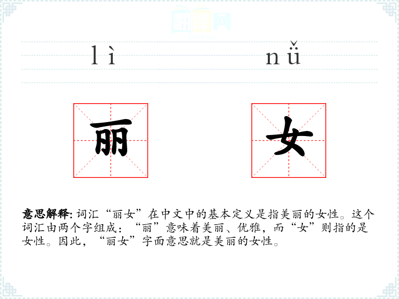 “丽”字在古代汉语中就有美丽的含义,如《诗经》中的“丽而不淫”。“女”字则是指女性。这两个字组合起来,形成了“丽女”这个词汇,其含义和用法在历史上相对稳定。