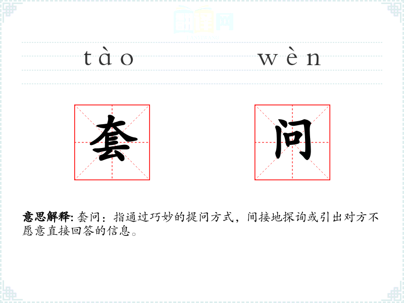 套问一词源于汉语,由“套”和“问”两个字组成。在古代汉语中,“套”有引诱、设计的意思,而“问”则是询问的意思。随着时间的推移,这个词逐渐演变为指通过巧妙的方式提问以获取信息。
