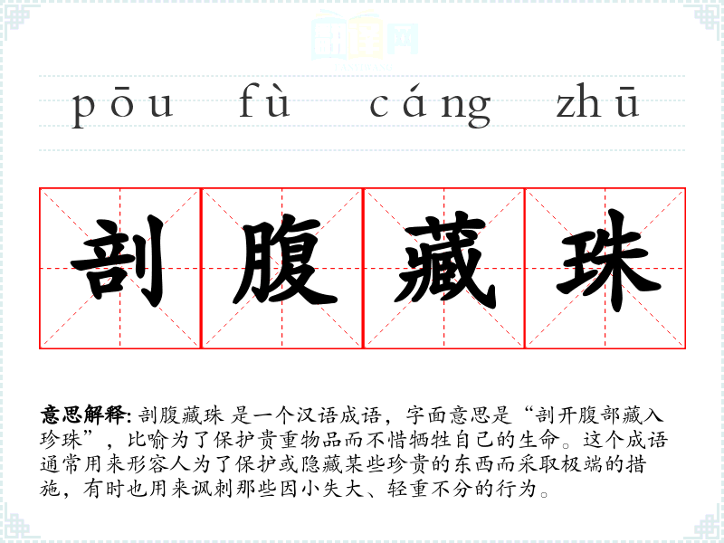 剖腹藏珠 是一个汉语成语,字面意思是“剖开腹部藏入珍珠”,比喻为了保护贵重物品而不惜牺牲自己的生命。这个成语通常用来形容人为了保护或隐藏某些珍贵的东西而采取极端的措施,有时也用来讽刺那些因小失大、轻重不分的行为。