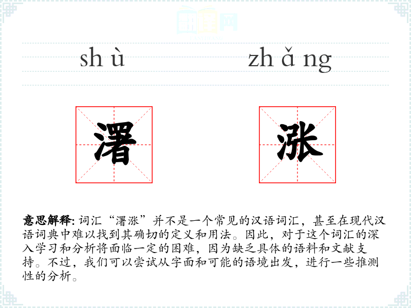由于“濖涨”不是一个标准词汇,我们无法对其进行深入的理解和总结。在语言学习和表达中,重要的是掌握和使用标准的、有明确意义的词汇,以确保沟通的准确性和有效性。对于不常见的词汇,我们应该谨慎使用,并在必要时寻求专业的解释和指导。