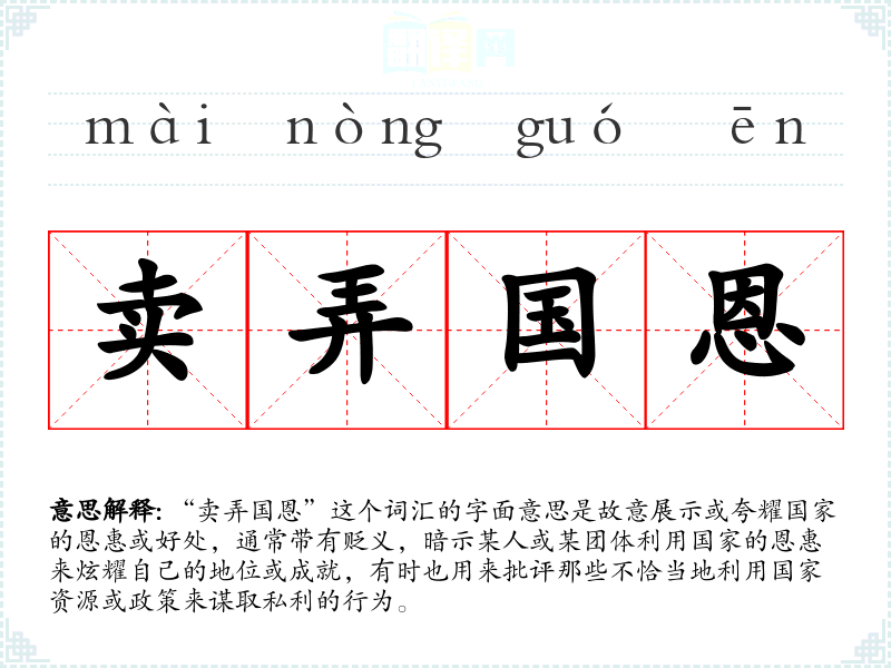 “卖弄国恩”这个词汇的字面意思是故意展示或夸耀国家的恩惠或好处,通常带有贬义,暗示某人或某团体利用国家的恩惠来炫耀自己的地位或成就,有时也用来批评那些不恰当地利用国家资源或政策来谋取私利的行为。