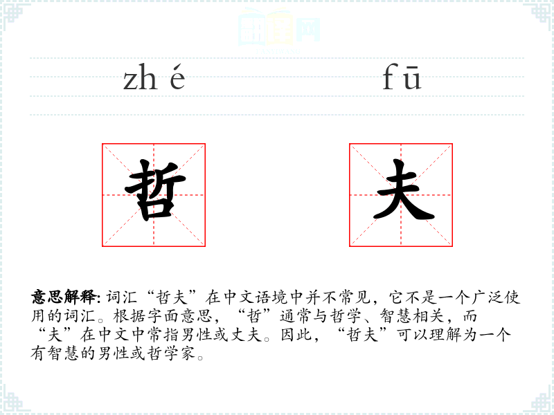 - 词源:“哲”源自古代汉语,意为智慧或哲学;“夫”源自古代汉语,意为男性或丈夫。