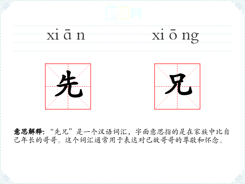 “先兄”是一个汉语词汇,字面意思指的是在家族中比自己年长的哥哥。这个词汇通常用于表达对已故哥哥的尊敬和怀念。