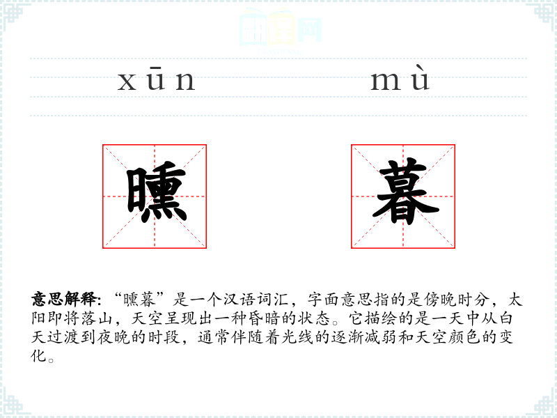 “曛暮”一词源自古代汉语,其构成部分“曛”意为日落时的余晖,“暮”则指夜晚的开始。在古代文学中,这个词汇经常出现,用以描绘特定的情感和场景。随着时间的推移,虽然在日常口语中使用频率降低,但在文学和艺术领域仍保持其独特的韵味。