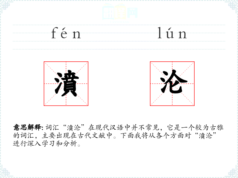 “濆”字在古代汉语中与水有关,表示水波涌起的样子。“沦”字则有沉没、消失的含义。这两个字组合在一起,形成了“濆沦”这个词汇,用来形容水波的动态变化,后来也用来比喻事物的兴衰更替。