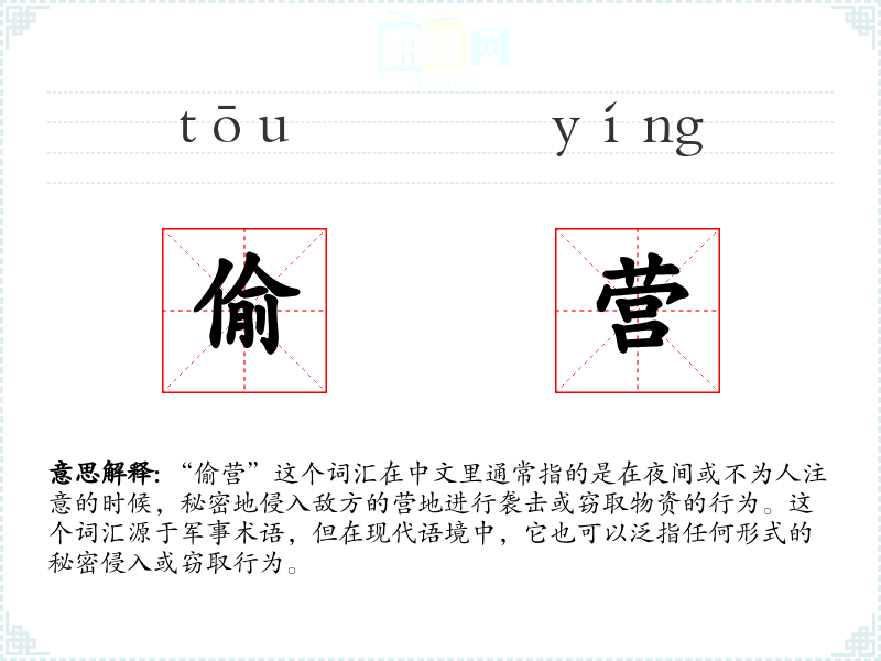 - 专业领域:在军事或安全领域,“偷营”是一个专业术语,用于描述特定的战术行动。