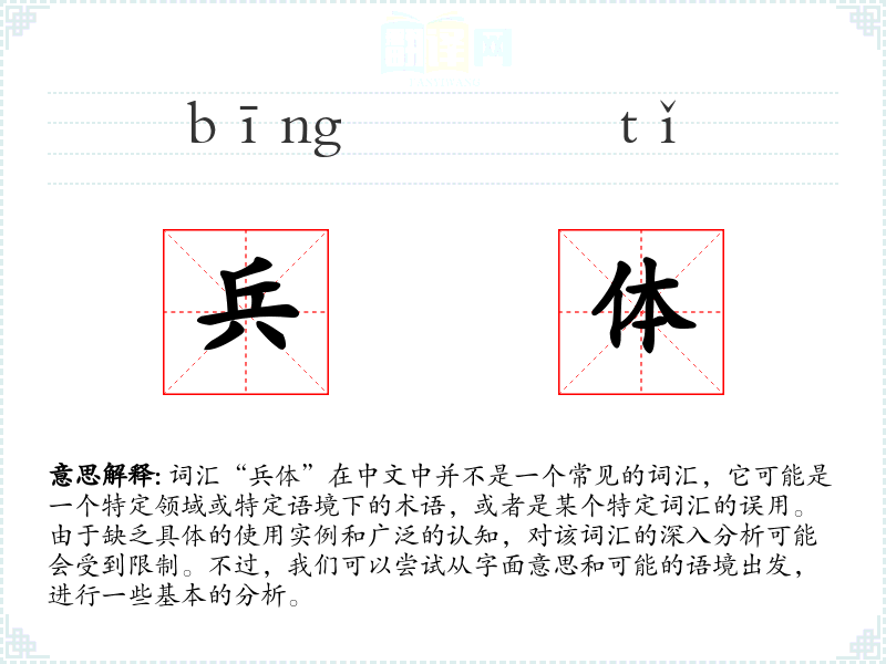 “兵体”字面意思可能是指与士兵或军事相关的身体状况或形态。然而,这个词汇在中文中并不常见,可能需要更多的上下文信息来确定其确切含义。